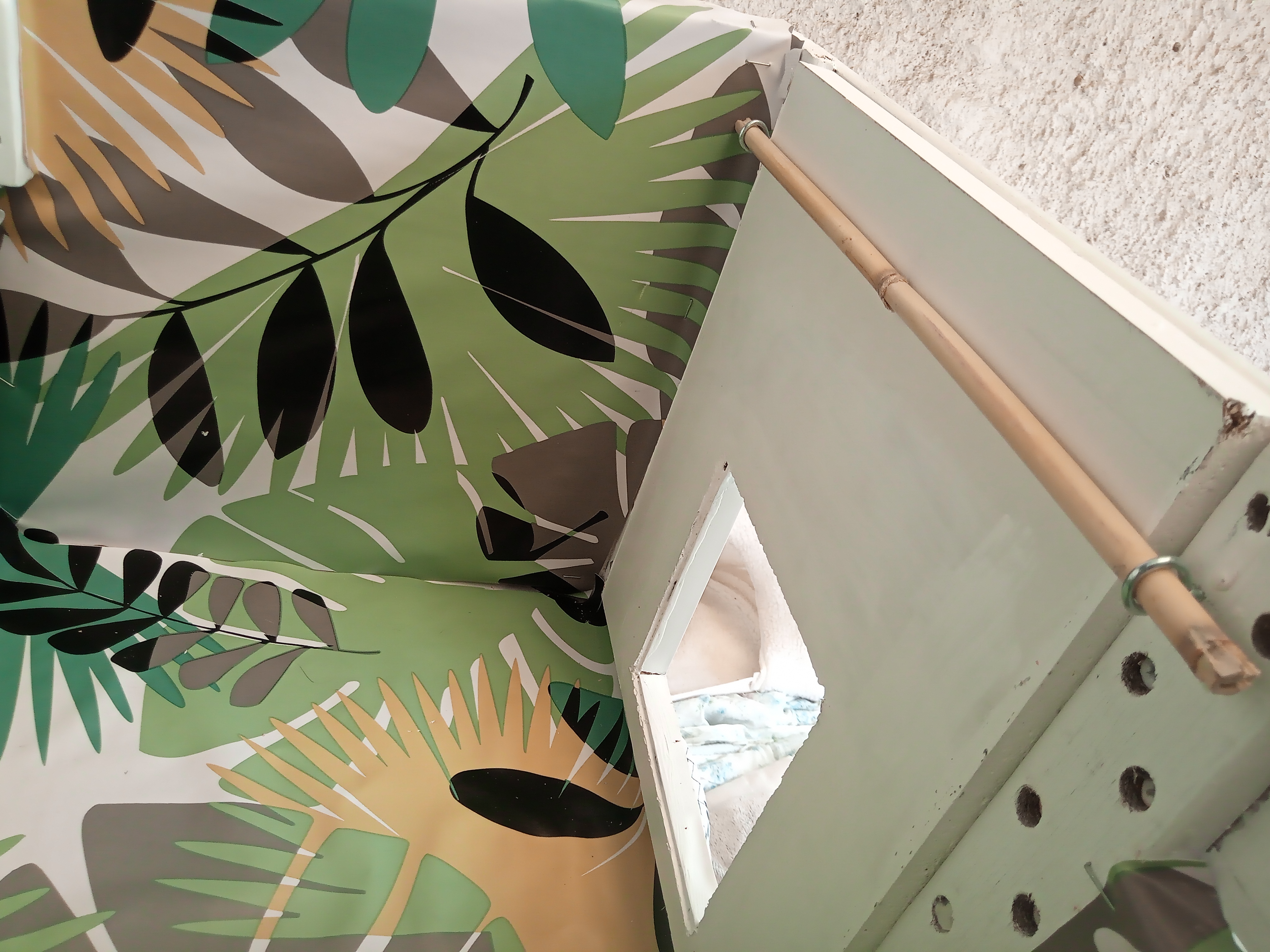 - sur les matériaux (aucun bois traité avec des produits succeptibles d'être nocifs n'est utilisé, les polystyrènes, mousses et autres isolants sont systématiquements doublés de toile cirée ou de bois pour éviter qu'ils ne partent en morceaux sous les coups de griffes ou simplement avec le temps),