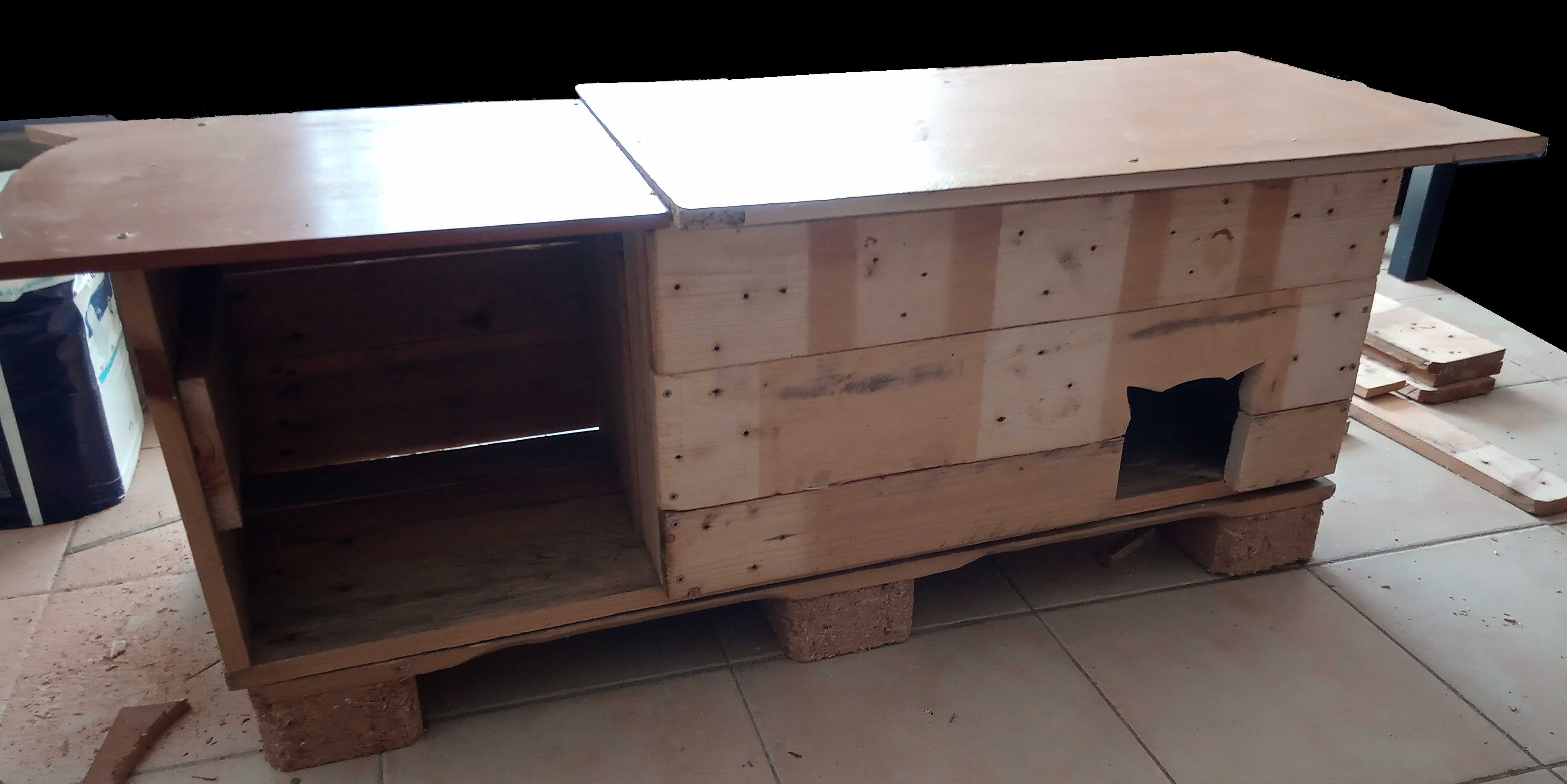 Fabriqué à partir de bois de palettes et de portes de placard. Les deux toits sont indépendants, celui de la partie couchage s'ouvre pour faciliter le changement des couvertures à l'intérieur.