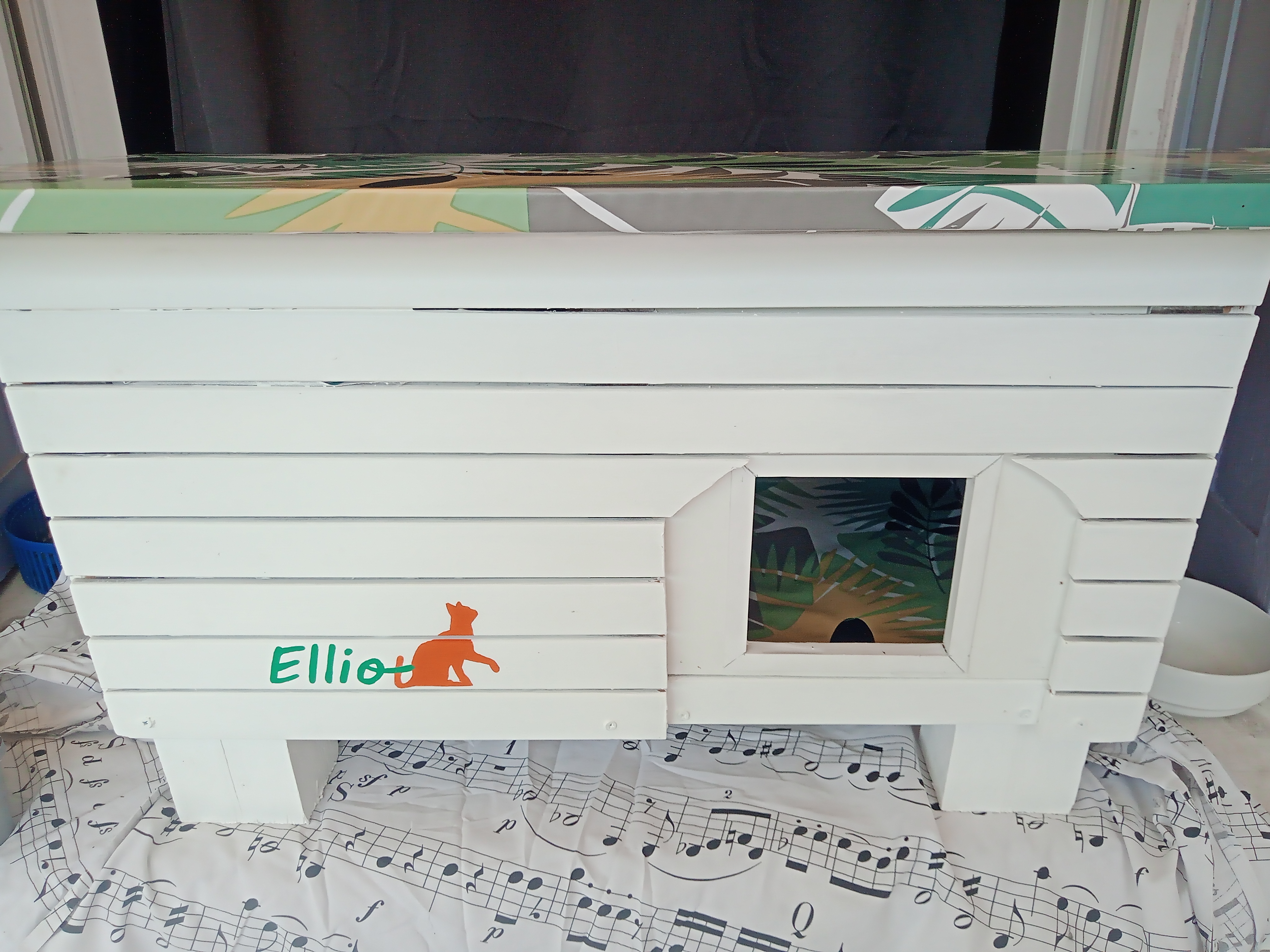 Réalisé à partir du plateau d'une vieille table de jardin en bois, d'aggloméré pour le fond et le toit, de plaques de polystyrène d'emballage (pour l'isolation) recouvert de toile cirée.